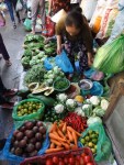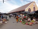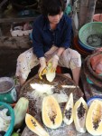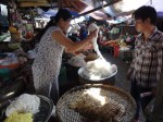 El día comenzó temprano con la esperada incursión a la plaza de mercado donde nos disponíamos a comprar todas las proteínas para la clase. Nos adentramos en un laberinto multicolor techado por una inmensa sábana de retazos de costales de arroz; donde el caminar a través de pollos frescos y vivos, miles de vegetales tendidos en lonas en el piso, cientos de pescados, carnes, tipos de fideos, arroces era toda una proeza para cualquier visitante. Pero nuestro guía sabía lo que hacía. Este pequeño y escuálido personaje se movía con gracia sin tropezar con ningún obstáculo, mientras yo apenas lograba mantenerme en pie. Si esquivaba la moto que cruzaba el camino con una docena de racimos de plátano, me tropezaba inevitablemente con la señora que cargaba a dos niños en sus brazos mientras sostenía una inmensa cesta en su cabeza llena de lychees. Tenía que caminar agachado pues el techo estaba diseñado obviamente para su estatura, tratando de tomar fotos con una mano mientras con la otra cuidaba sigilosamente mi mochila debido al sabio y triste reflejo colombiano de tener todas las pertenencias bajo custodia. La algarabía era ensordecedora. Desde todos los puestos gritaban precios, pesos y categorías, creando un murmullo que hacia aún más difícil el guardar el equilibro y el no terminar tumbando cualquiera de las pirámides de relucientes frutas apiladas en el piso.